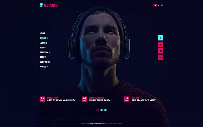 special offer$49 DJ & Night ClubWordPress ThemeACIDUM – is a modern WordPress theme created specially for night clubs, disco, party, music online stores, DJ, MC, club dancers and other.View demosPurchaseAmazing design3+ homepage layoutsEasy customizableMobile friendlyCommerce readyGreat supportHomepage layouts01. Disco Night Club02. Night Club Video Background03. DJ Personal Websitestay tuned...Theme Futures Powerfull Admin Interface Automatic Updates 3+ Homepage Layouts Well Documented Google Fonts Amazing Parallax Effects SEO Optimized No Coding RequiredBrowsers Compatibility The theme looks great on all modern versions of browsersEasy Color Customization One Clickdemo installation Get OnlineDocumentation